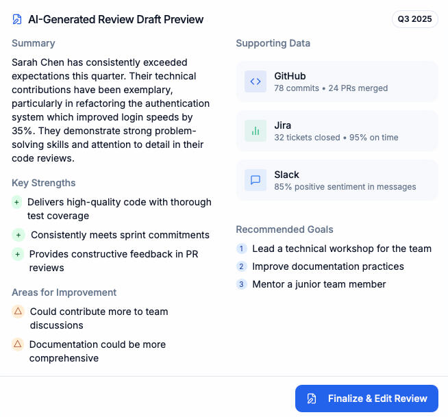 See what’s working, where support is needed, and draft reviews in minutes — not hours.
